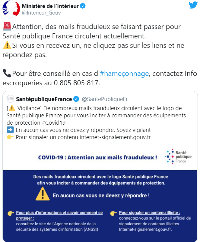 Vous en avez peut-être déjà reçu dans vos boîtes mail. Le ministère de l’Intérieur alerte aujourd’hui sur l’afflux de mails frauduleux prétendument envoyés par Santé Publique France. Leur logo et leur nom sont ainsi utilisés dans des mails vous incitant à commander des équipements de protection contre la covid-19 (masques, gel hydroalcoolique…). Bien sûr, ces mails sont totalement faux. Santé Publique France appelle à la vigilance des internautes : « En aucun cas vous ne devez y répondre. »